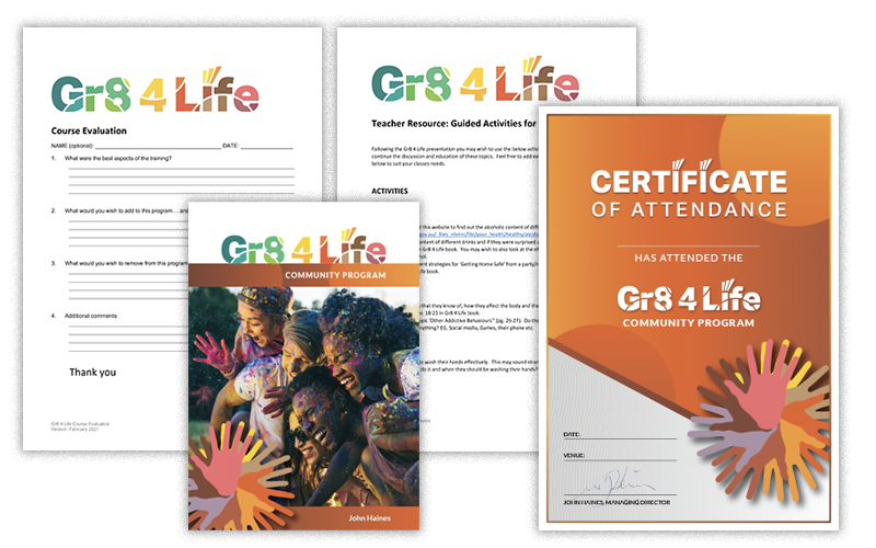 The Gr8 4 Life®program has been developed by John Haines for teenagers, young people and adults to learn strategies in tackling the major issues of Drugs, Alcohol, Depression and Suicide Prevention in a simple, down-to-earth, well-structured short course.